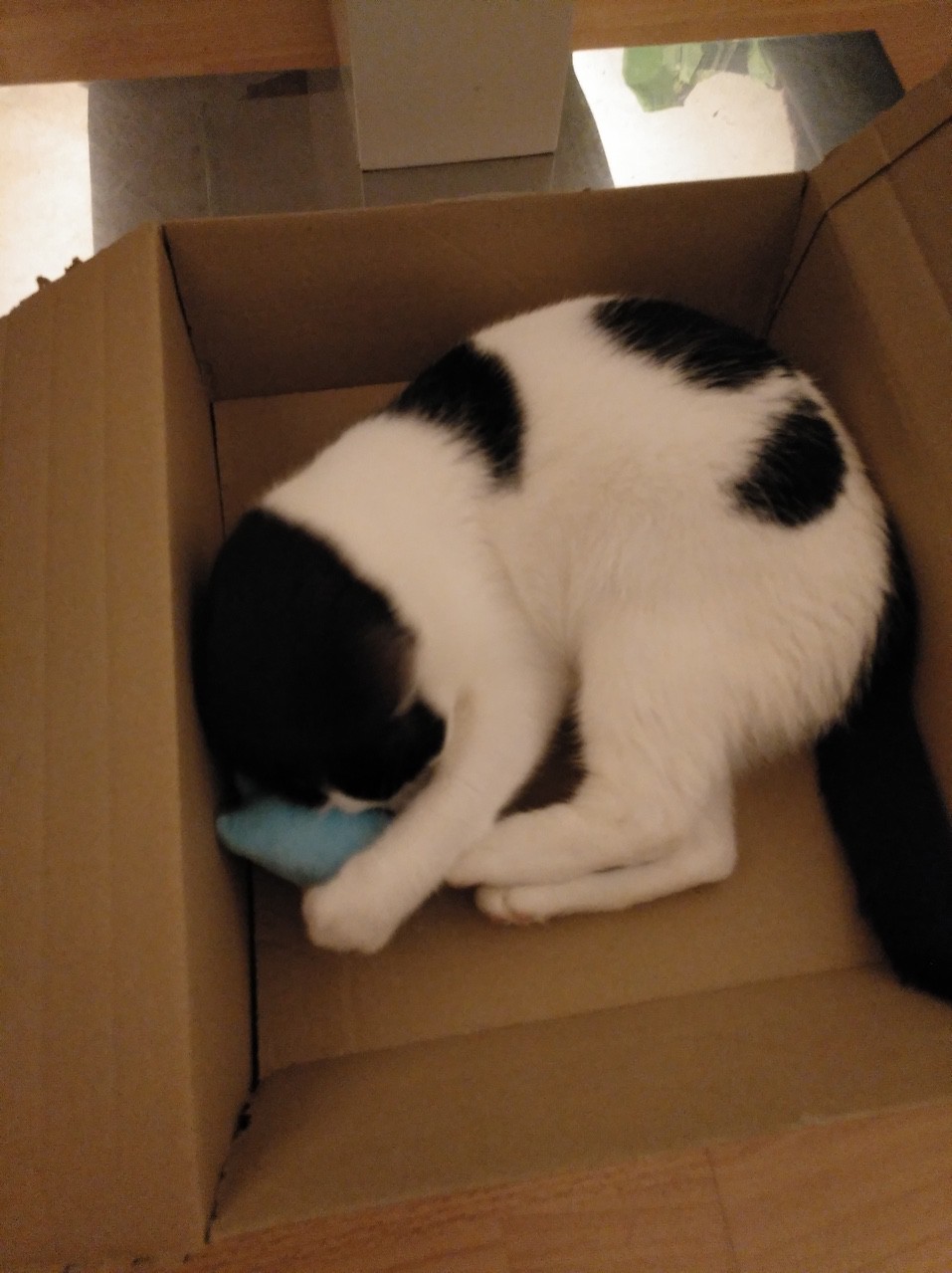 Die ersten zwei Nächte war Max viel unterwegs auf Schlafplatzsuche, wurde dann aber fündig auf einer kuscheligen Decke. Melika hat sich vom ersten Tag an für einen Karton entschieden, den wir uns nicht trauen zu entsorgen.