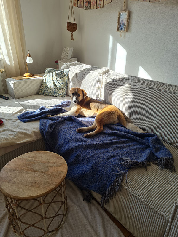 Bonny ist gut bei mir zu Hause angekommen. Mit Geduld haben wir die ersten Herausforderungen (Treppensteigen) gemeistert, so dass es mittlerweile alleine klappt. Zu Hause hat sie sich im Wohnzimmer direkt am wohlsten gefühlt. Hier liegt sie am Liebsten rum, schläft, kuschelt oder spielt mit ihrem Koala. Sie kommt hier gut zur Ruhe und kann sich entspannen. Meine Anwesenheit genießt sie, kommt aber auch gut ohne mich (auf der Couch) klar :)