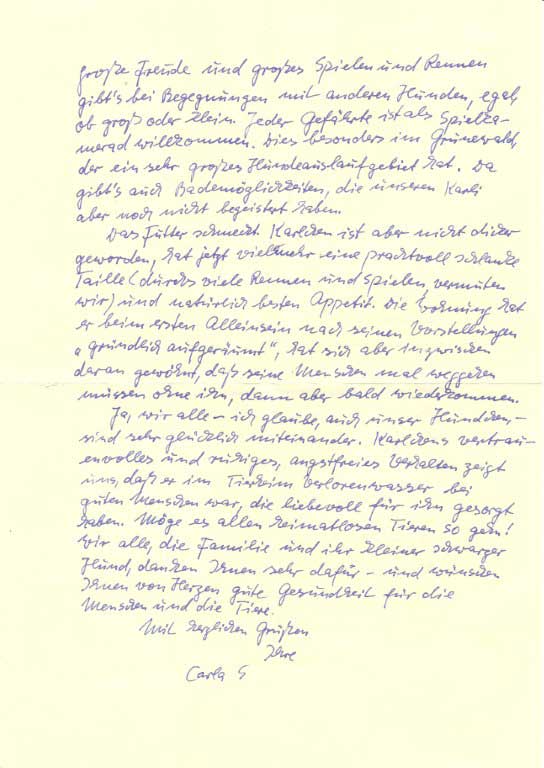 Das Futter schmeckt. Karlchen ist aber nicht dicker geworden, hat jetzt vielmehr eine prachtvoll schlanke Taille (durchs viele Rennen und Spielen, vermuten wir) und natürlich besten Appetit. Die Wohnung hat er beim ersten Alleinsein nach seinen Vorstellungen "gründlich aufgeräumt", hat sich aber inzwischen daran gewöhnt, daß seine Menschen mal weggehen müssen ohne ihn, dann aber bald wiederkommen.