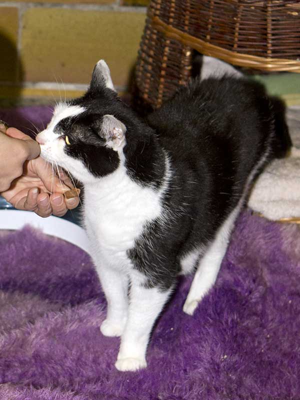 Pünktchen lässt sich nun in ihrem neuen Zuhause mit Leckerchen verwöhnen...