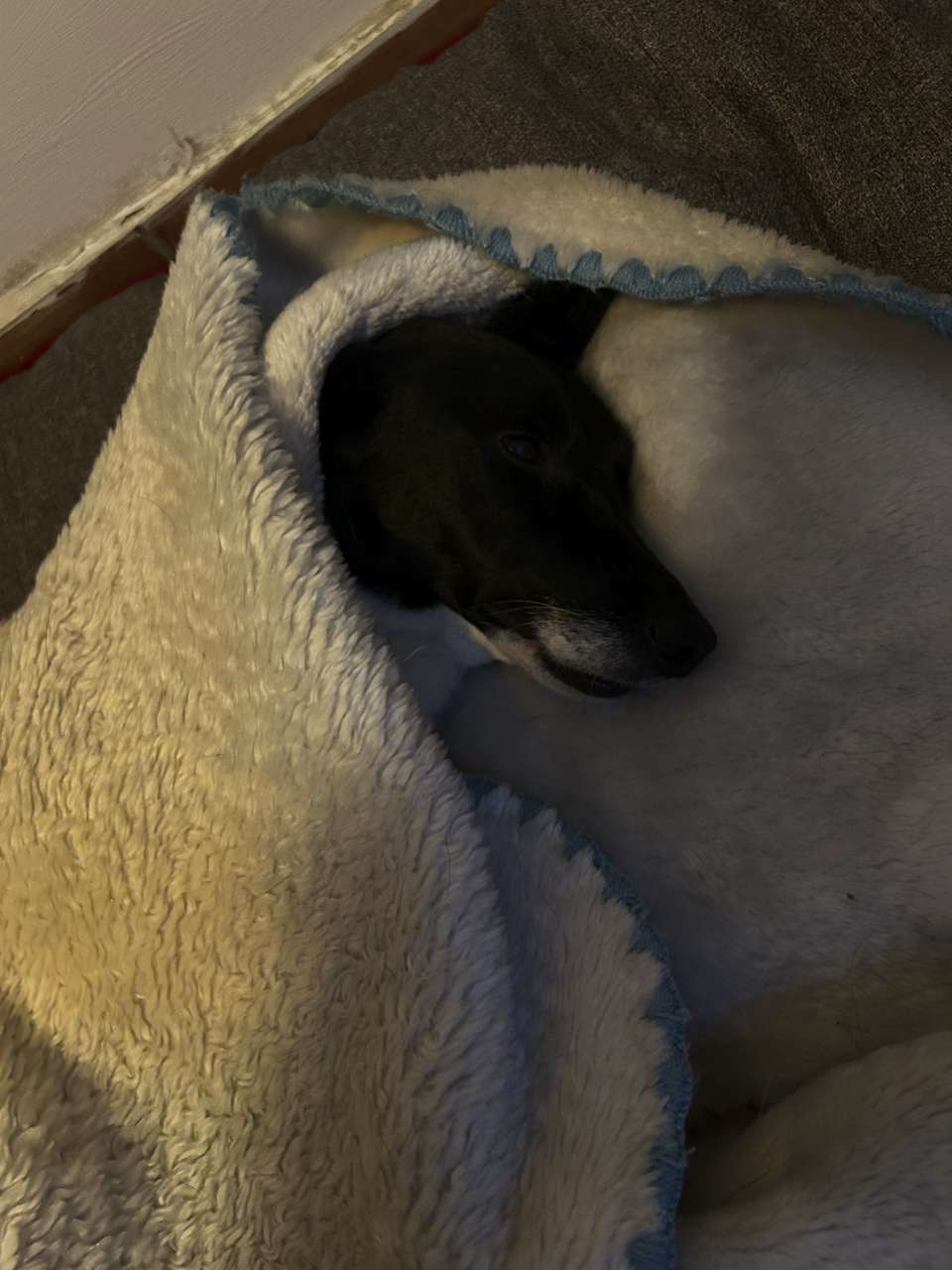 Sie schlief in unserem Beisein , friedlich in ihrer Decke beim Tierarzt ein.